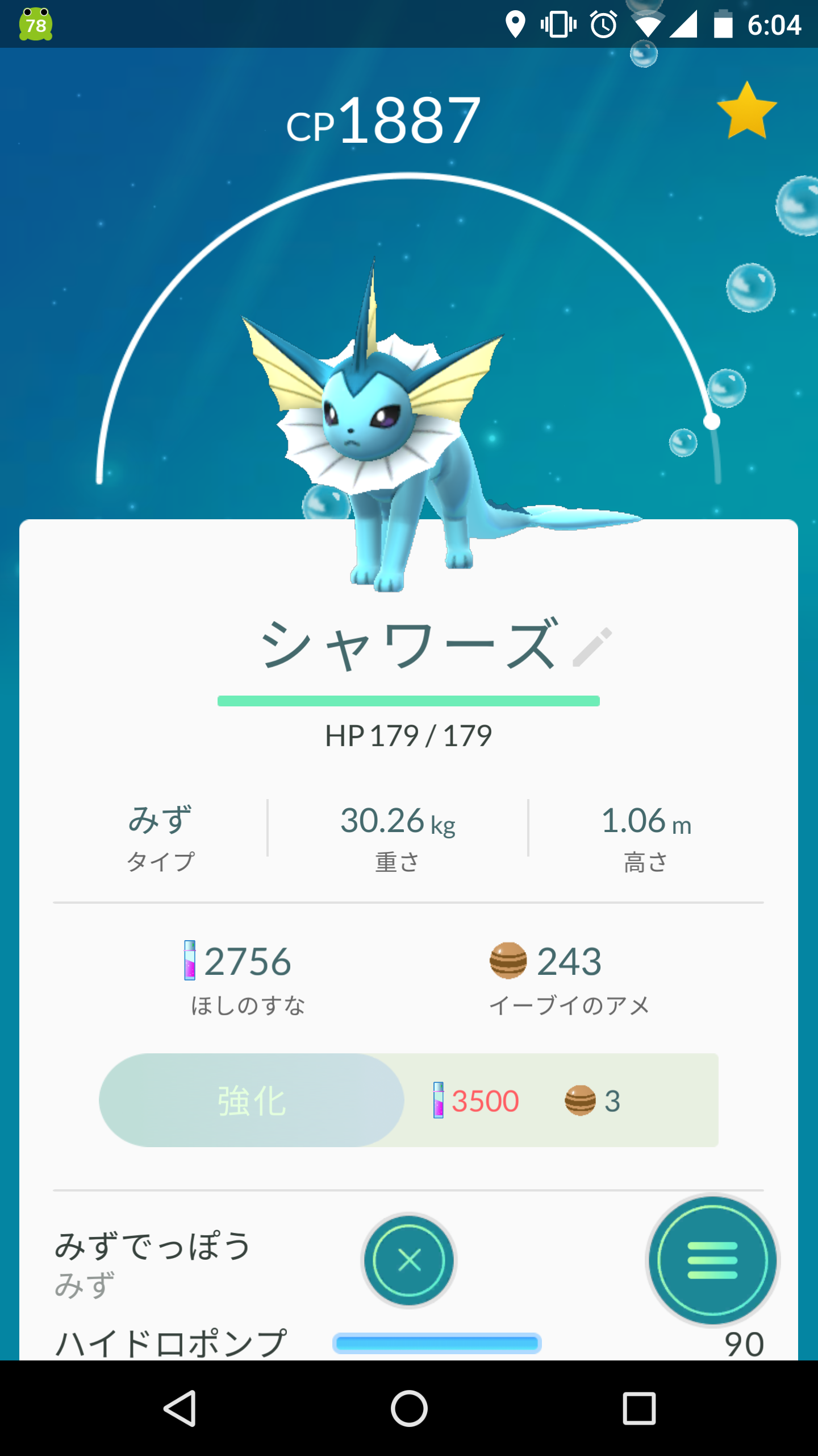 又、期待のイーブイからやっとみずでっぽう・ハイドロポンプ持ちのシャワーズができましたので、手持ちの砂を全投入し、ここまで育ちました